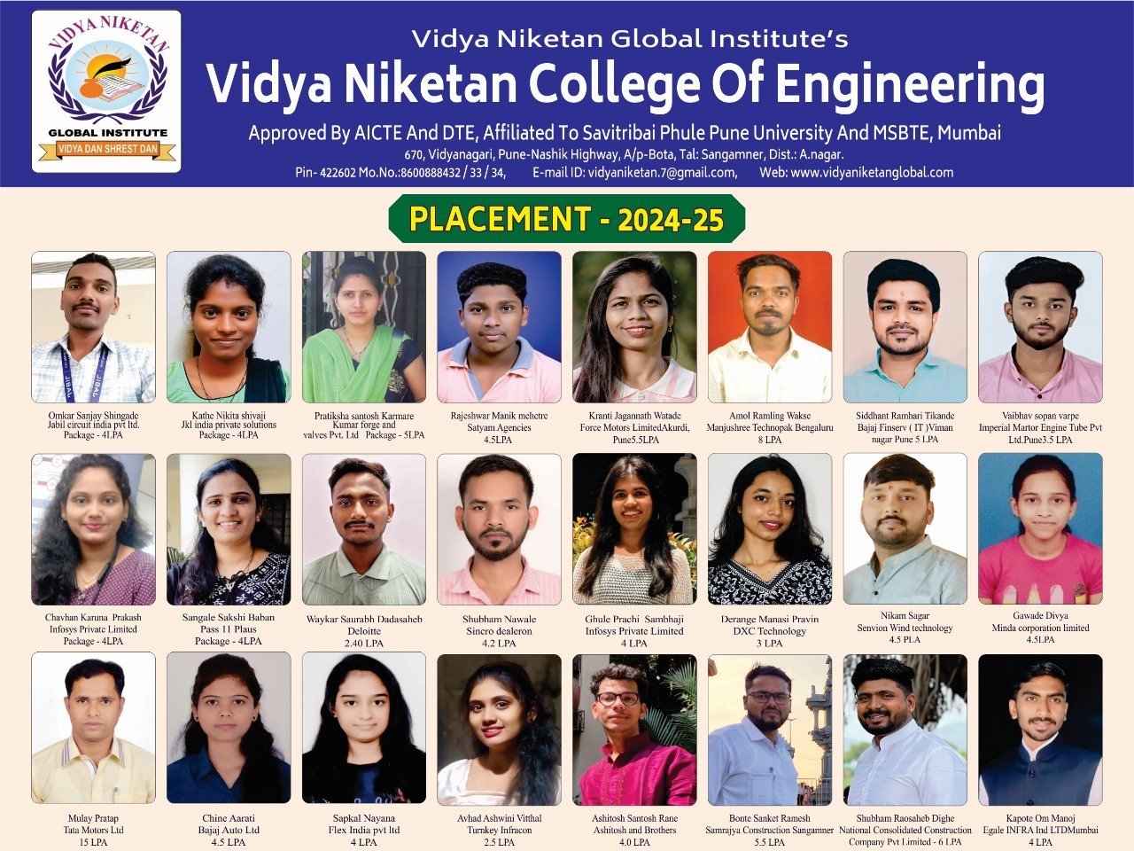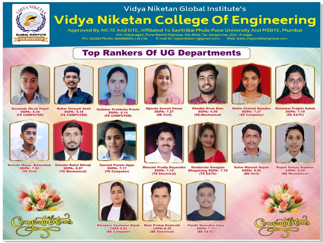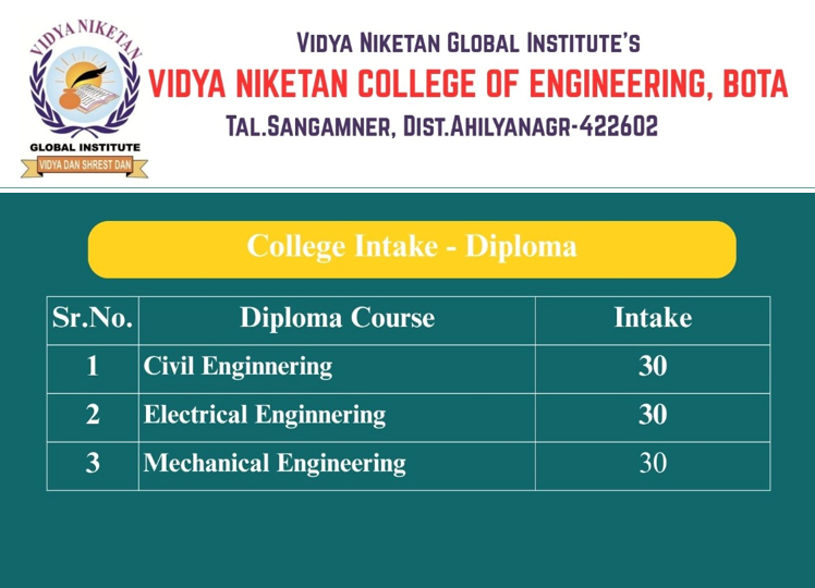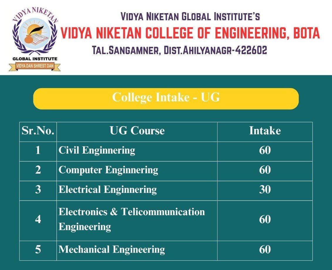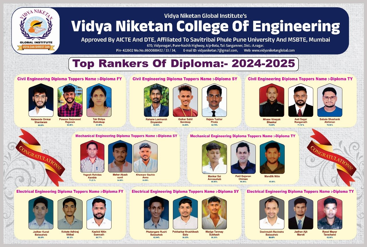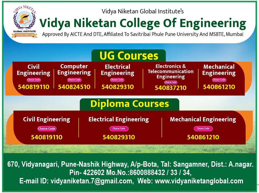 Vidya Niketan College of Engineering is a leading engineering college in Ahmednagar, located on the Pune–Nashik Highway, offering degree and diploma programs with modern infrastructure and strong placement support.